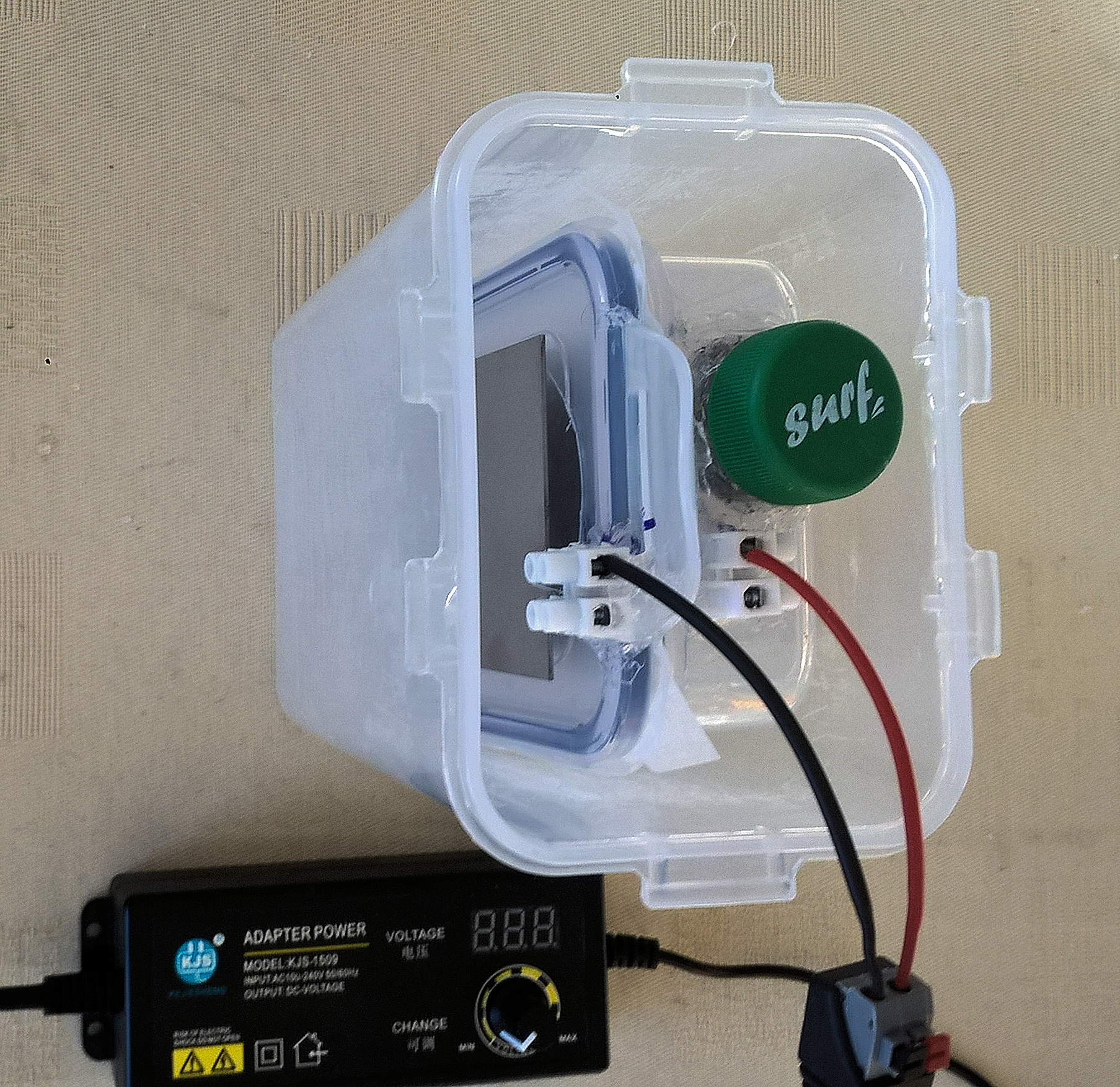 Bildbeschreibung: Das 350 ml fassende Innenteil mit den Elektroden ist im 1,3 Liter-Außenbehälter und mit dem Netzgerät verbunden. Sobald in beide Kammern das Elektrolysewasser (aus destilliertem Wasser oder Osmosewasser mit Natriumchlorit (NaClO2) eingefüllt wurde, kann die Elektrolyse beginnen.