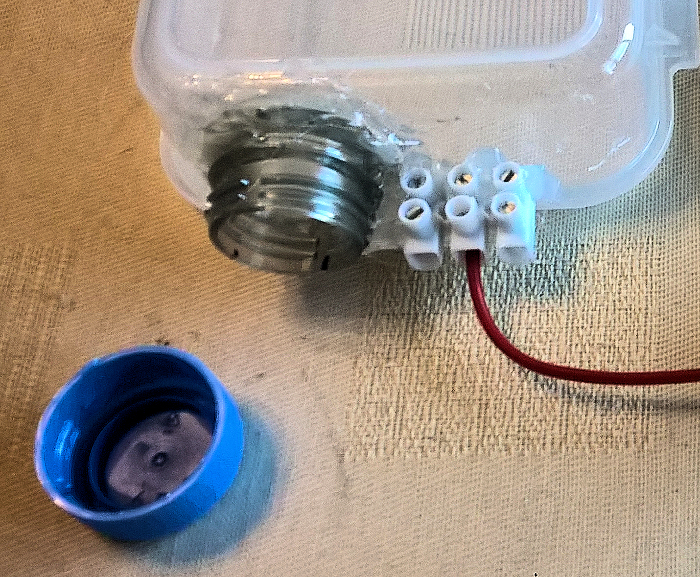 Bildteil rechts: Unterteil der 360 ml-Dose mit 3er Lüsterklemme für Anoden-Elektrode mit rotem Plus-Pol-Kabel