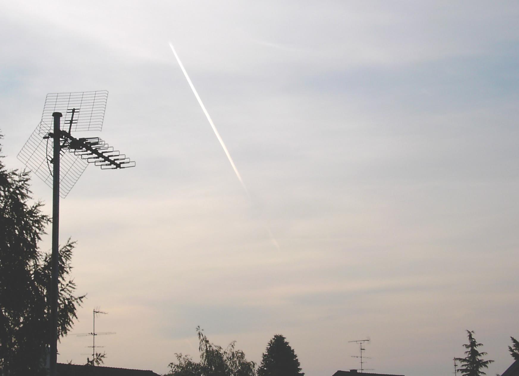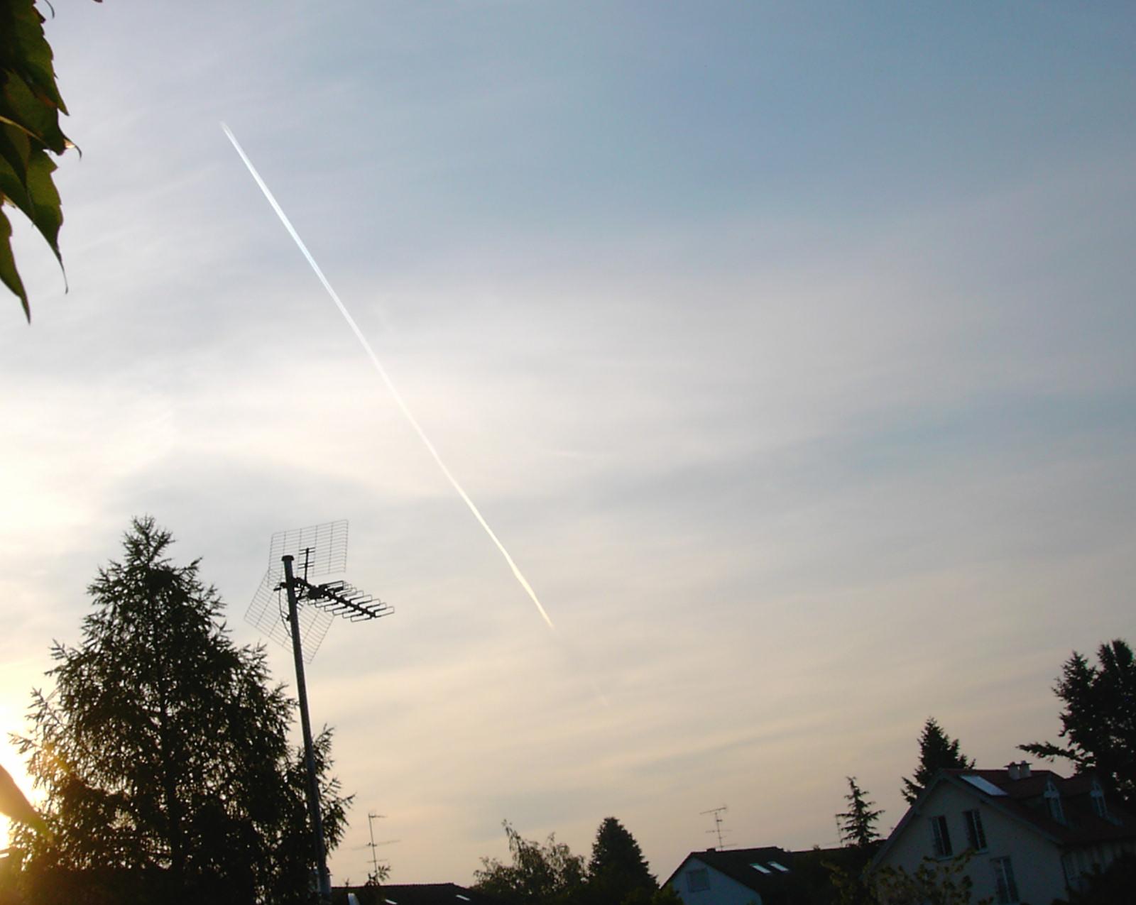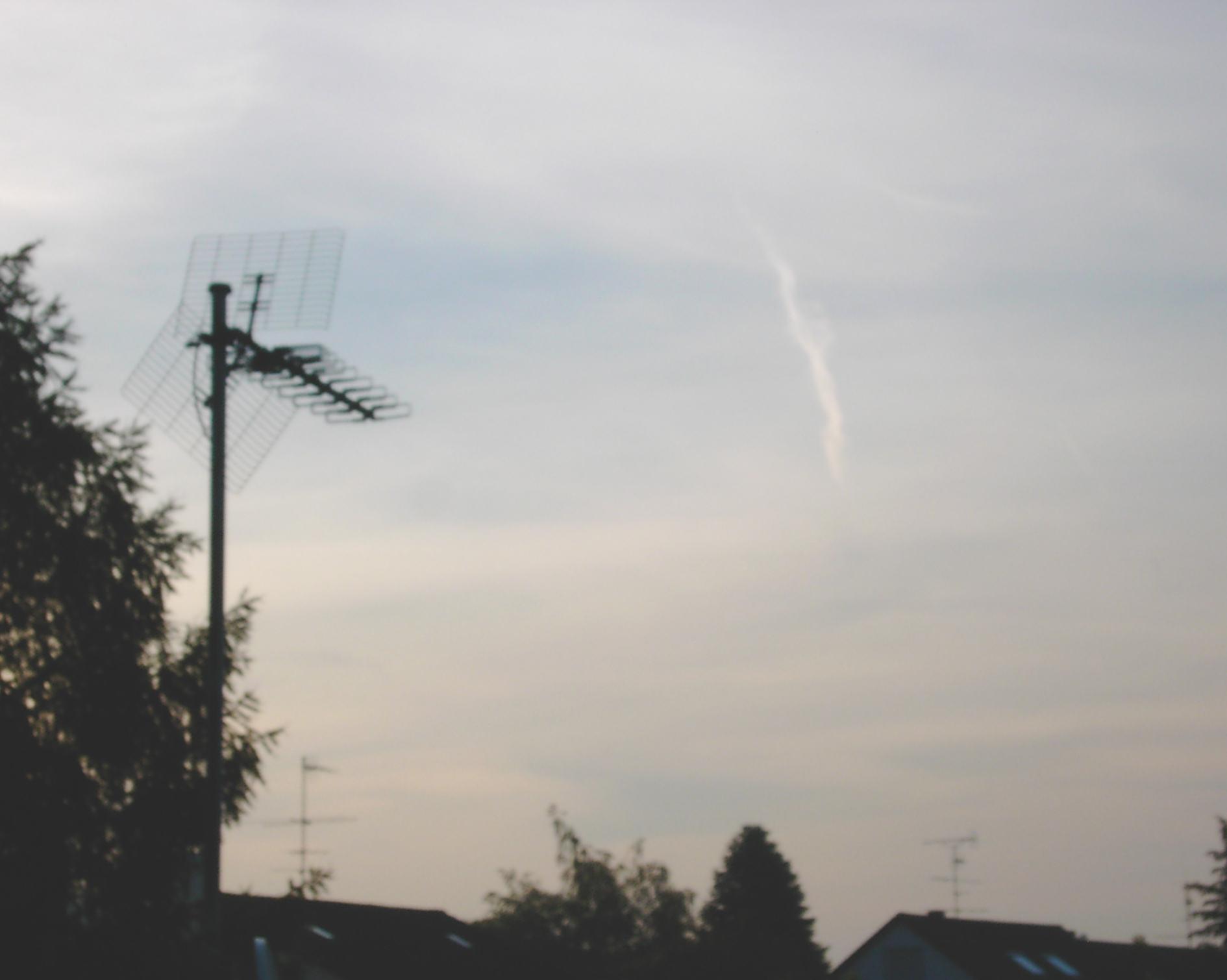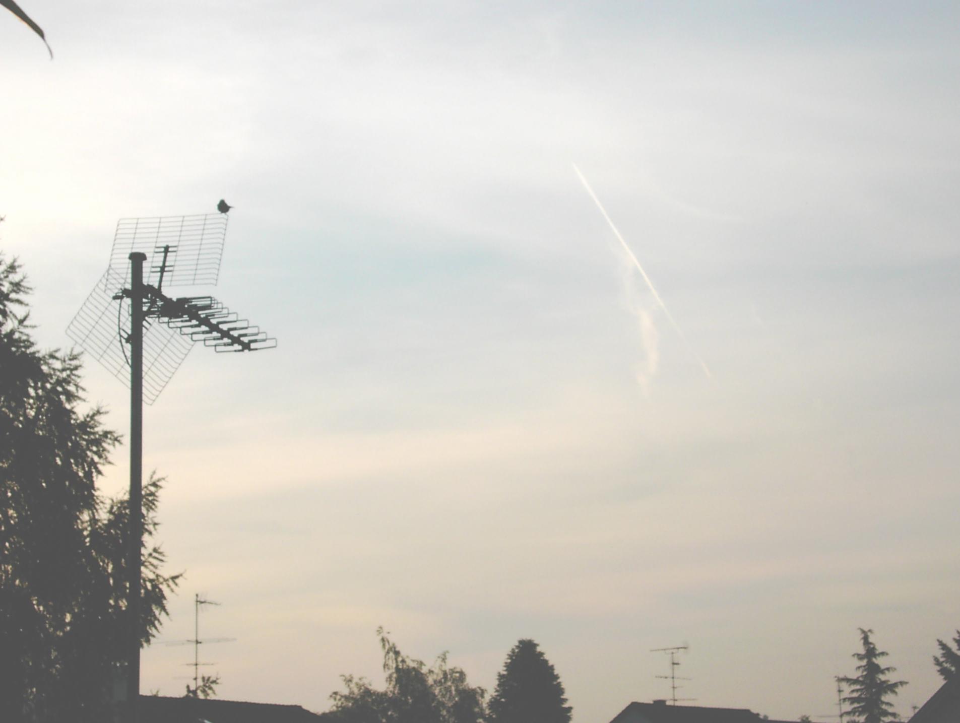 10.06.04, 06Uhr21-40: 6 Min. später ist von der Flugspur nur noch der untere Teil (Antennenhöhe) übrig = Hinweis auf kurzzeitiges Chemtrailsprühen in den Kondensstreifen hinein.