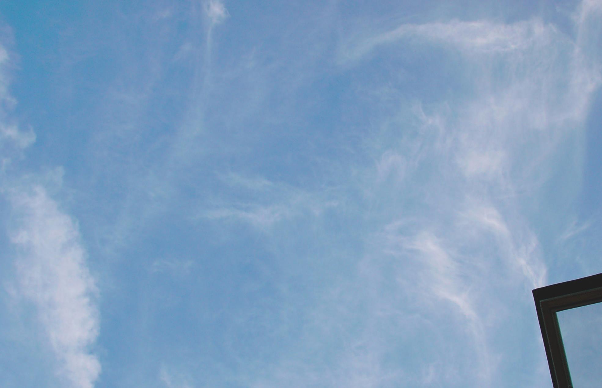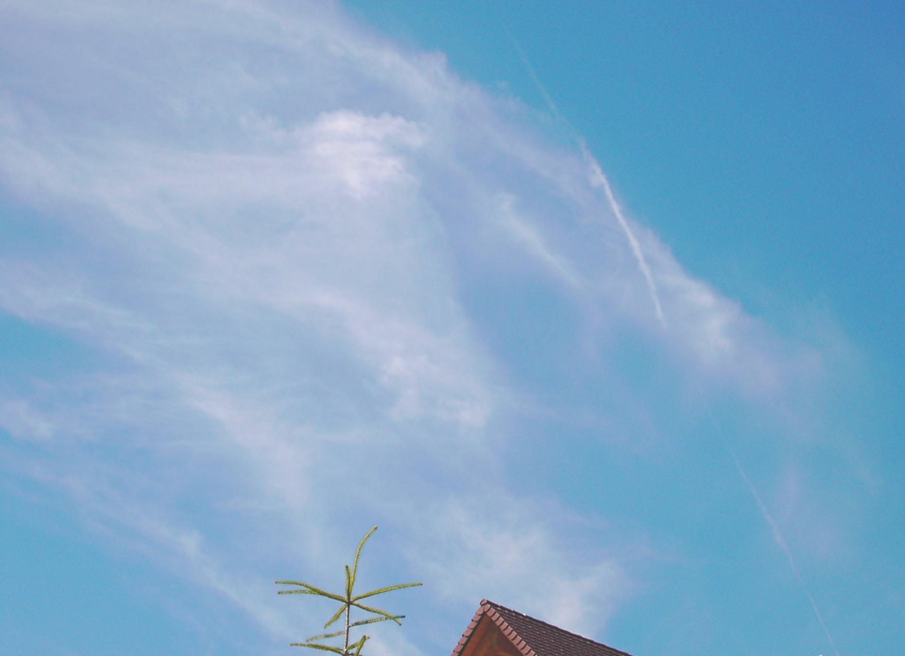 Wolkenfeld aus 4-5 parallelen Chemtrails. Beginn eines neuen CT rechts oben unmittelbar vor dem existierenden Wolkenfeld!