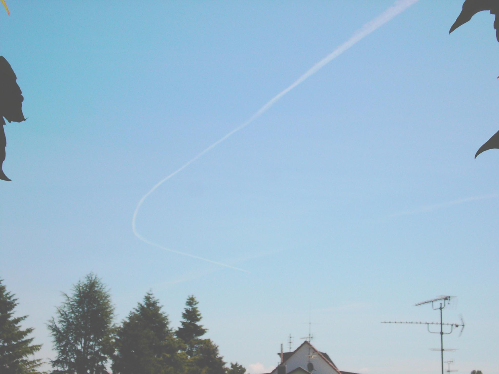 09.06.2004, 12 Uhr 55-24: Flugzeug, das schon Kilometer vorher massive Streifen nach sich zog. Foto Richtung S-O. 09.06.2004, 13 Uhr 00-44: dasselbe Flugzeug, das noch minutenlang massive Streifen nach sich zog und auf seiner Flugbahn 2 Kurven (vor Aufnahmebeginn nach links, hier nach rechts) flog. Hier Foto Richtung O.