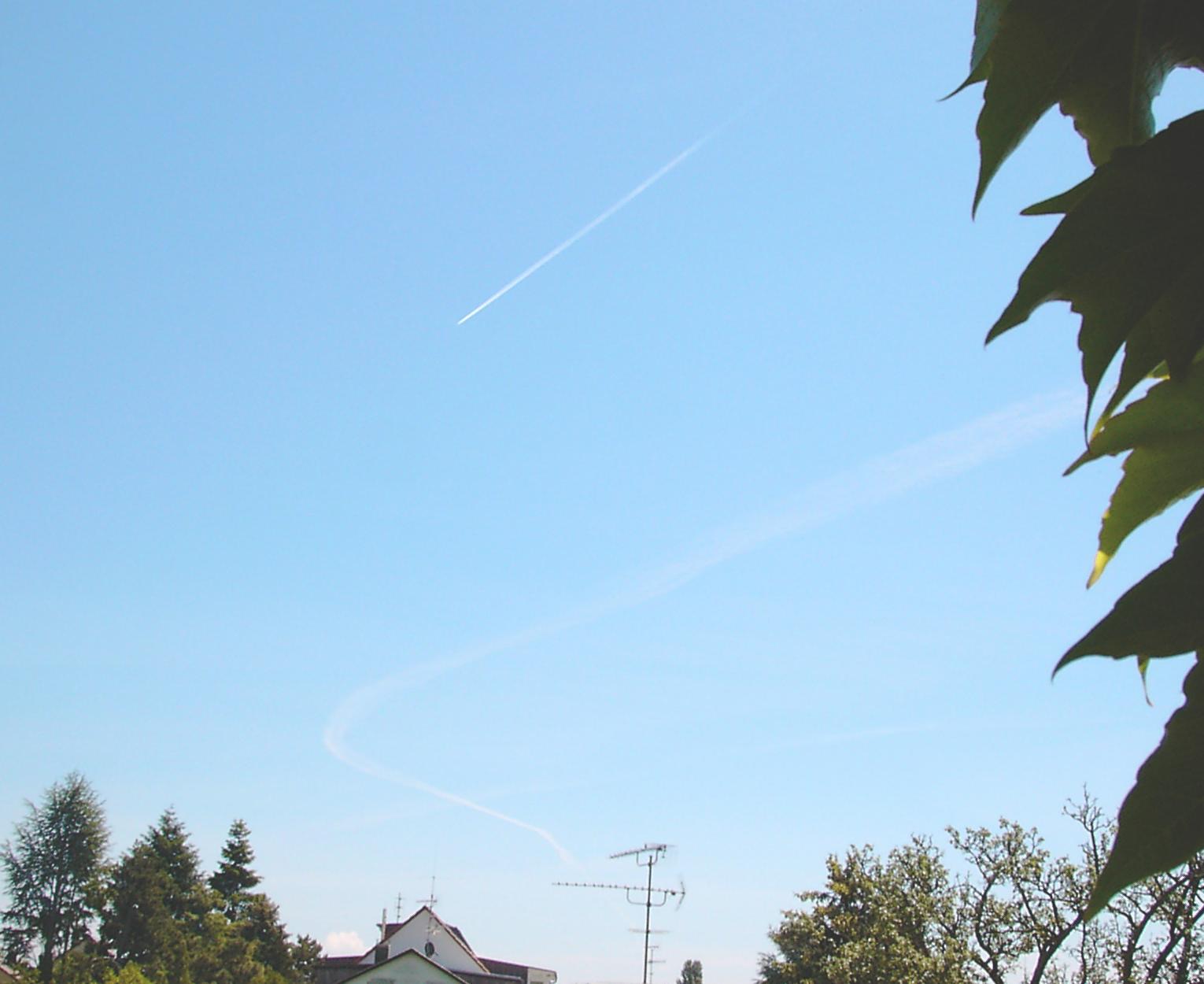 09.06.2004, 13 Uhr 09-50: Der Vergleich beider Flugzeugbahnen zeigt beim Folgeflugzeug nur kurzen Kondensstreifen (Contrail). Unterschied zwischen Chemtrail und Contrail ist zweifellos beweiskräftig.