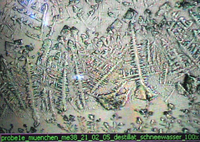 Fotograf Chr. Diebel verdampfte u.a. Schneewasser- und Regenwasserproben und fotografierte die übriggebliebenen pulverartigen und kristallartigen Überreste. Nachfolgende Mikroskop-Aufnahmen erfolgten mit 100facher Vergrößerung von Schneewasser- und Regenwasserproben unter einem Bresser Bino Researcher Mikroskop 1250x. Objekte wurden zuerst auf 10:1 eingedampft, dann eine Probe auf einen Objektträger gegeben und mittels der Hitze einer Halogenlampe im Januar 2006 getrocknet. Es haben sich Kristalle gebildet.
