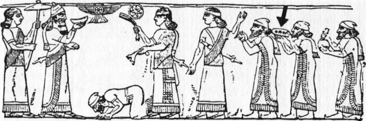 Beachten Sie, welche Ähnlichkeit mit den runden Waffeln besteht, die auf der Zeichnung des assyrischen Monumentes zu sehen sind. In dieser Szene beugt sich ein Mann vor einem Priester-König unter einem Sonnenbild. Der zweite Mann von rechts bringt ein Opfer dar: runde Waffeln, mit Kreuzen gekennzeichnet!